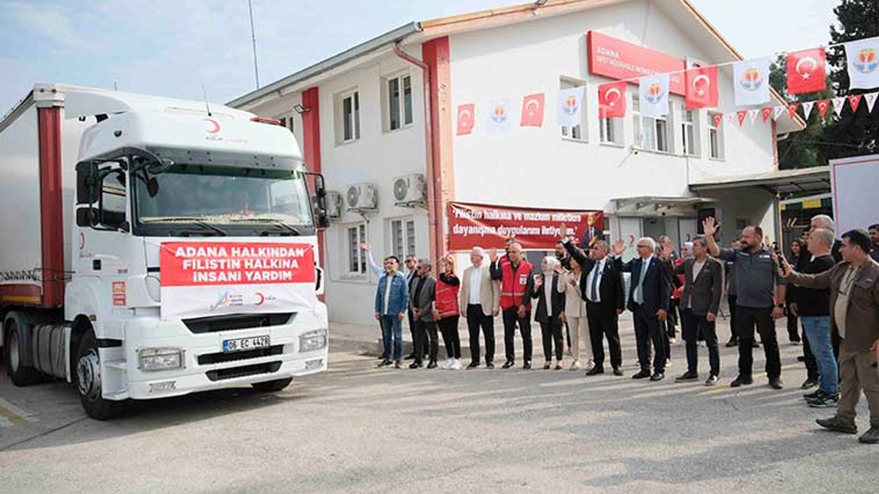 Tırların üzerinde “Adana halkından Filistin halkına insani yardım’ pankartları yer aldı.